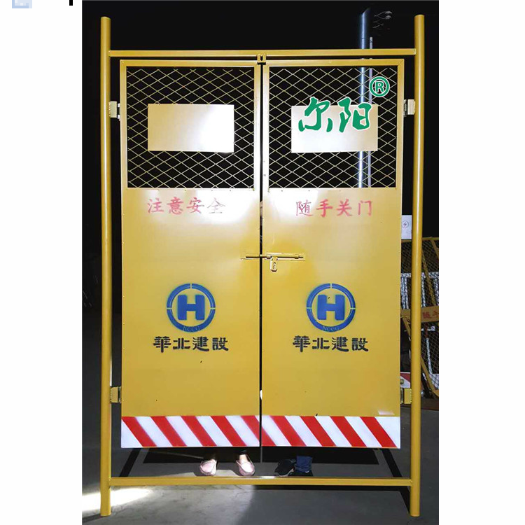 一般施工電梯防護(hù)門(mén)采用黃色的漆料,底部噴有黃黑相間的踢腳板,達(dá)到警示警醒的目的。門(mén)框采用國(guó)家標(biāo)準(zhǔn)2*3cm的方矩管焊接而成(方矩管可根據(jù)客戶要求而定做)強(qiáng)度高,拗不脫焊,質(zhì)量穩(wěn)定。門(mén)栓采用鍍鋅成套門(mén)栓,外形美觀,使用方便。門(mén)栓設(shè)在外面只能由電梯操作人員打開(kāi)防護(hù)門(mén),有效的防止樓層內(nèi)等候的施工人員打開(kāi)防護(hù)門(mén)。杜絕了高空拋物或墜物的潛在風(fēng)險(xiǎn)。門(mén)面采用小孔鋼板網(wǎng)或鐵絲網(wǎng)片與鋼板焊接而成,這樣可以有效的防止等候的施工人員把手伸出去而產(chǎn)生施工電梯運(yùn)行發(fā)生意外,有便于電梯操作人員觀察樓內(nèi)的情況。還有 利于樓內(nèi)外的溝通交流。門(mén)面中間位置噴有警示標(biāo)語(yǔ)和下面的踢腳板警示線,對(duì)施工人員起到了警醒目的。門(mén)軸采用16#圓管焊接而成,安裝方便,只需在外架立桿上與門(mén)軸相對(duì)應(yīng)的位置焊接90度直角圓管,然后在把防護(hù)門(mén)掛上就可以使用,摘卸方便。